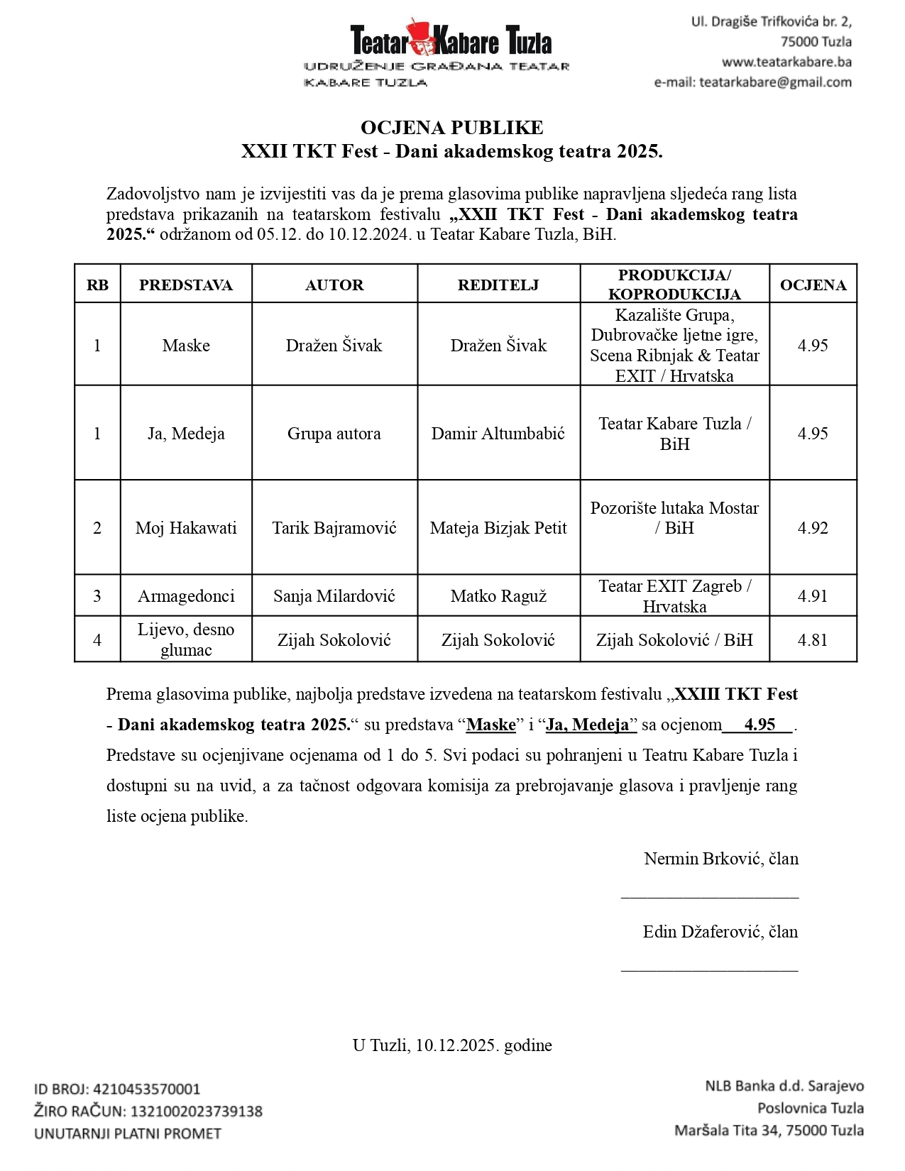 Ovim rezultatima publika je na poseban način istaknula umjetničku snagu obje predstave, agrađujući glumačku virtuoznost, posvećenost i dramaturšku izražajnost. Zatvaranjem 23. TKT Festa spuštena je zavjesa na još jedno izdanje festivala koje je donijelo raznovrstan, hrabar i savremen teatarski program, te ponovo potvrdilo Tuzlu kao važan prostor susreta akademskog teatra, profesionalnih umjetnika i publike željne kvalitetnog scenskog izraza.